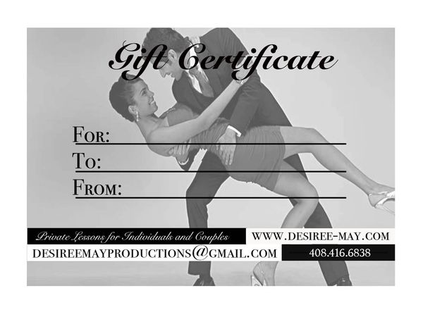 Gift certificates can be e-mailed for print-out or mailed to you. Gift Certificates only valid for 1 hour "Intro Lesson and Consult" or 4 Lesson Group Class.